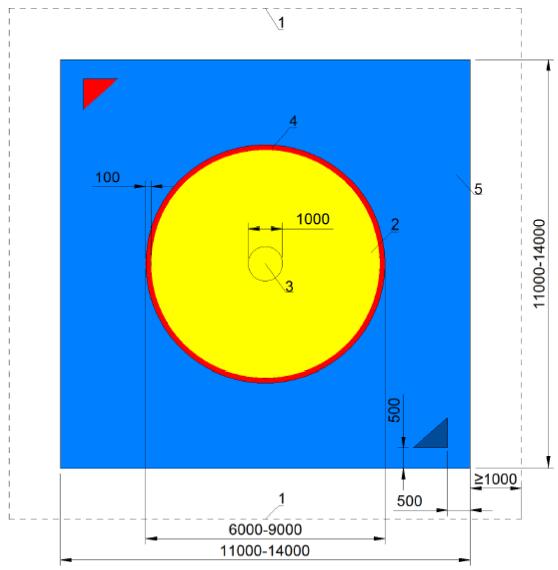 1 - граница площадки (помоста); 2 - рабочая зона ковра; 3 - центр ковра; 4 - линия границы "зачетной зоны"; 5 - зона безопасности