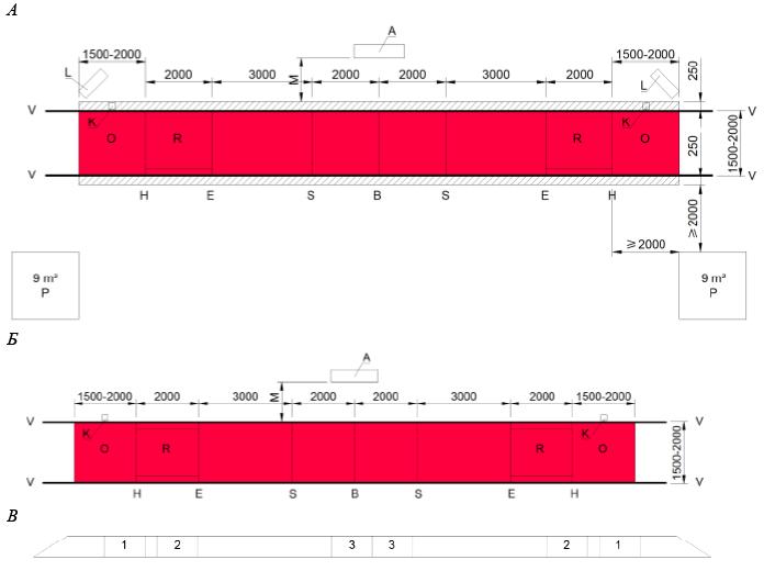 А - спортивная зона для фехтования; Б - разметка поля боя для фехтования; В - Помост. Вид сбоку