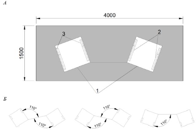 А - спортивная зона для фехтования на колясках; Б - варианты расположения платформ крепления кресел-колясок 1 - фиксируемая платформа; 2 - рама; 3 - крепление кресел-колясок