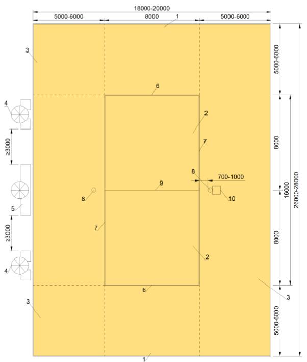 1 - зона подачи; 2 - площадка; 3 - свободная зона; 4 - место команды; 5 - стол секретаря; 6 - лицевая линия; 7 - боковая линия; 8 - стойка; 9 - сетка; 10 - судейская вышка