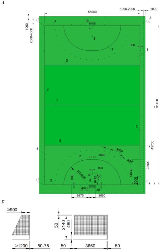 А - спортивная зона для хоккея на траве; Б - ворота для хоккея на траве 1 - средняя линия; 2 - боковая линия; 3 - задняя линия; 4 - линия ворот; 5 - четверть линия; 6 - зона четверть линии; 7 - круговая линия; 8 - центральная точка штрафной зоны; 9 - угловые флажки; 10 - ворота
