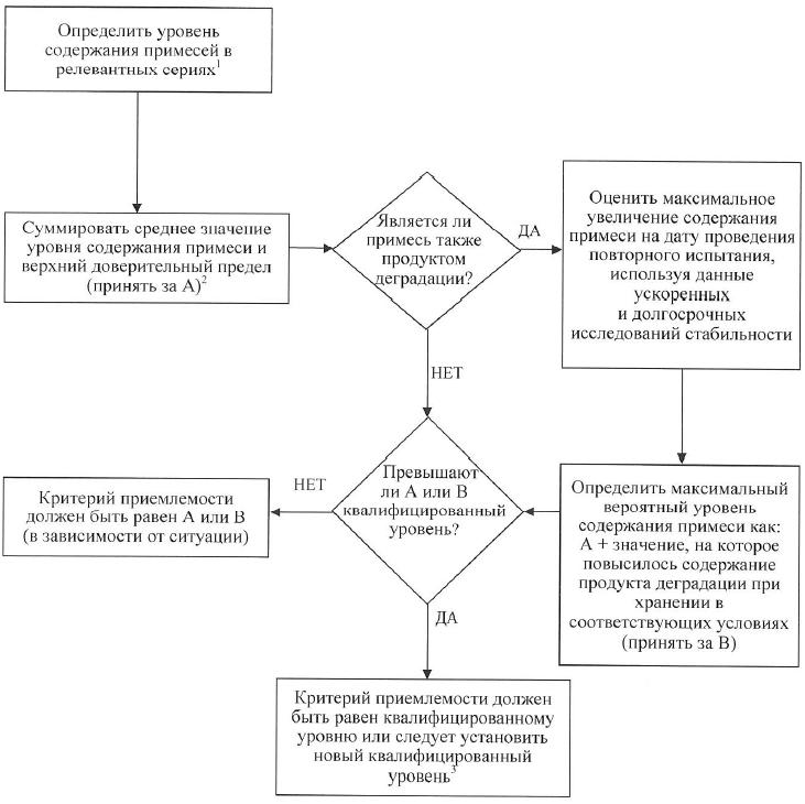 36. В схеме решений N 2 описана экстраполяция значимых пределов содержания продуктов деградации на основе данных, полученных в процессе разработки. На момент подачи регистрационного досье лекарственного препарата данных для оценки постоянства процесса производства лекарственного препарата, как правило, недостаточно. В связи с этим нецелесообразно устанавливать критерии приемлемости, которые охватывают только данные анализа серий, имеющиеся на момент подачи регистрационного досье лекарственного препарата.