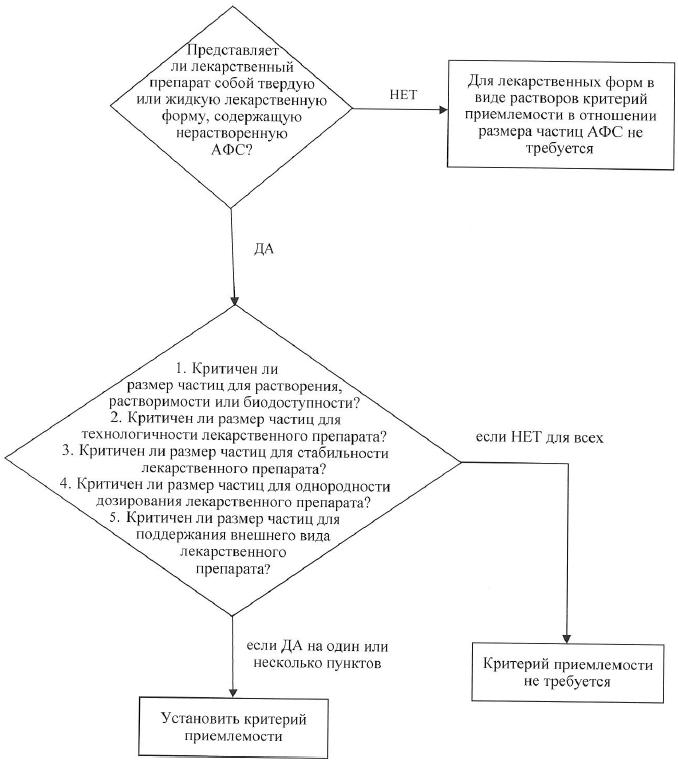 б) размер частиц. Для некоторых активных фармацевтических субстанций, предназначенных для использования в твердых лекарственных препаратах или суспензиях, размер частиц может оказывать значительное влияние на скорость растворения, биодоступность и (или) стабильность. В таких случаях следует установить критерии приемлемости и проводить испытание по определению размера частиц с использованием соответствующей методики. В схеме решений N 3 представлены дополнительные пояснения в отношении имеющихся случаев проведения испытания по определению размера частиц;