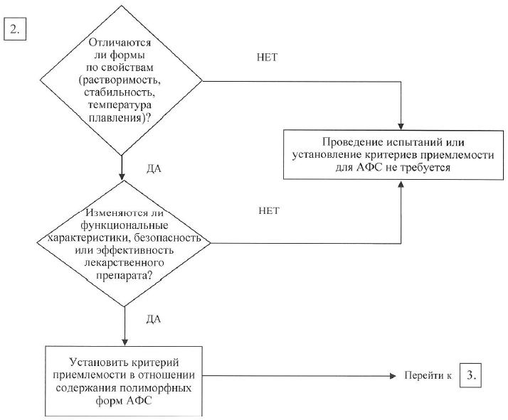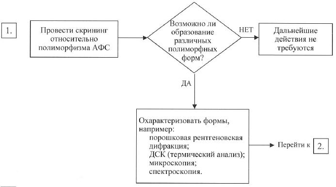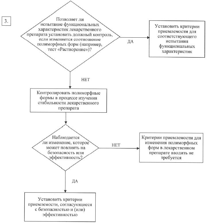 в) полиморфные формы. Некоторые активные фармацевтические субстанции существуют в разных кристаллических формах, которые различаются по своим физическим свойствам. Полиморфизм может также включать в себя продукты сольватации и гидратации (псевдополиморфы) и аморфные формы. Различия в профиле указанных форм могут в некоторых случаях оказывать влияние на качество и функциональные характеристики лекарственных препаратов. Если существуют различия с доказанным влиянием на функциональные характеристики лекарственного препарата, его биодоступность или стабильность, то в спецификации необходимо указать соответствующее состояние твердого вещества. Физико-химические измерения и методы обычно используются для определения наличия нескольких полиморфных форм (например, точка плавления (включая микроскопию при высокой температуре), инфракрасная спектроскопия (ИК) для веществ в твердом состоянии, порошковая рентгеновская дифракция, методики термического анализа (включая дифференциально-сканирующую калориметрию (ДСК), термогравиметрический анализ (ТГА) и дифференциально-термический анализ (ДТА)), Рамановская спектроскопия, световая микроскопия и спектроскопия ядерного магнитного резонанса (ЯМР) для веществ в твердом состоянии). В схемах решений N 4 (1) - 4 (3) представлены дополнительные пояснения, когда и как следует контролировать и проверять полиморфные формы. Указанные схемы решений следует применять последовательно. В схемах решений N 4 (1) и 4 (2) рассматривается, проявляет ли активная фармацевтическая субстанция полиморфизм и могут ли различные полиморфные формы повлиять на функциональные характеристики лекарственного препарата. Схему решений N 4 (3) следует использовать в том случае, если активная фармацевтическая субстанция проявляет полиморфизм и он оказывает влияние на функциональные характеристики лекарственного препарата. С помощью схемы решений N 4 (3) можно проанализировать возможность изменения профиля полиморфных форм в лекарственном препарате, а также способность такого изменения оказывать влияние на его функциональные характеристики.