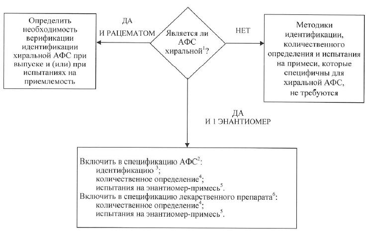 г) испытания для хиральных активных фармацевтических субстанций. Если активная фармацевтическая субстанция представляет собой преимущественно 1 энантиомер, а содержание противоположного энантиомера ниже квалификационных и идентификационных пороговых значений, приведенных в правилах по изучению примесей в лекарственных средствах и установлению требований к ним в спецификациях, утверждаемых Комиссией, то противоположный энантиомер не определяется по причине практической сложности определения при его низком уровне содержания. Однако такую примесь в хиральной активной фармацевтической субстанции и соответствующих ей лекарственных препаратах следует контролировать в соответствии с правилами по изучению примесей в лекарственных средствах и установлению требований к ним в спецификациях. В схеме решений N 5 представлено обобщение условий, требующих проведения испытаний идентификации хиральных соединений, испытаний на определение содержания примесей и на количественное определение как для активных фармацевтических субстанций, так и для лекарственных препаратов в соответствии со следующими концепциями.