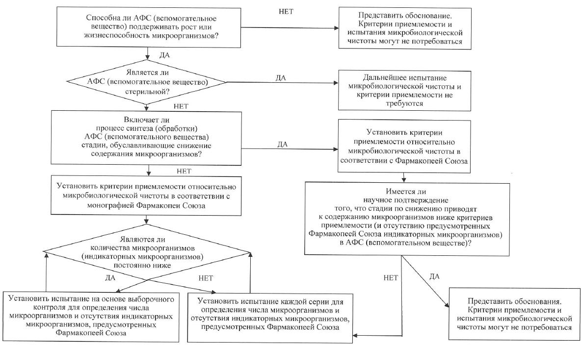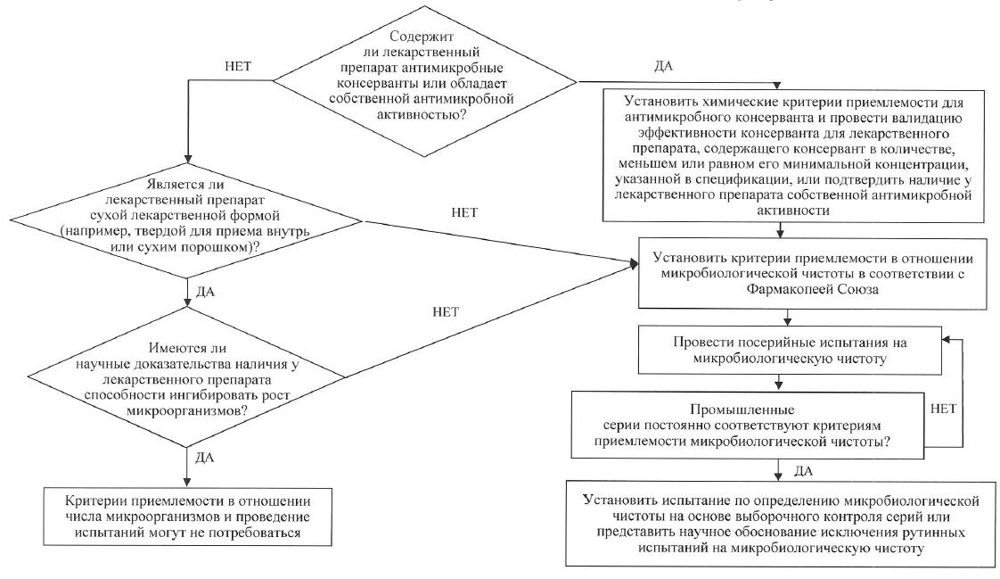 В спецификации необходимо указать критерии приемлемости для содержания общего количества аэробных микроорганизмов, общего количества дрожжевых и плесневых грибов, а также информацию о полном отсутствии определенных видов бактерий, наличие которых в лекарственном препарате не допускается (например, Staphylococcus aureus, Escherichia coli, Salmonella spp., Pseudomonas aeruginosa). Микробиологическую чистоту следует определять с помощью подходящих фармакопейных методик, при этом частота отбора проб или временные точки производственного процесса должны быть обоснованы данными и накопленным опытом. При выборе вида испытаний на микробиологическую чистоту и критериев приемлемости следует учитывать природу активной фармацевтической субстанции, способ производства и назначение лекарственного препарата. При должном научном обосновании в отношении жидких лекарственных форм для приема внутрь допускается не проводить испытания на микробиологическую чистоту. Дополнительные пояснения о том, в каких случаях следует проводить микробиологические испытания, представлены в схеме решений N 8;