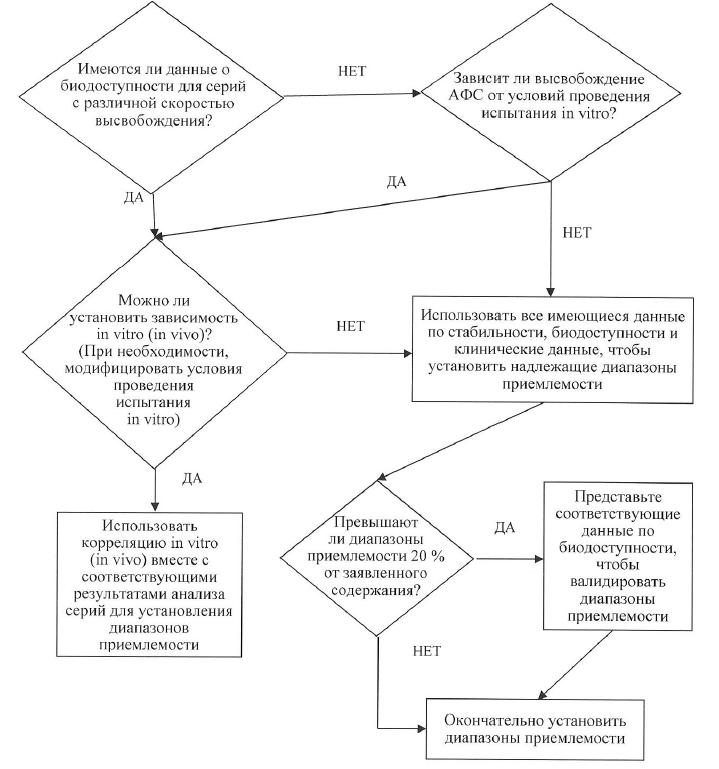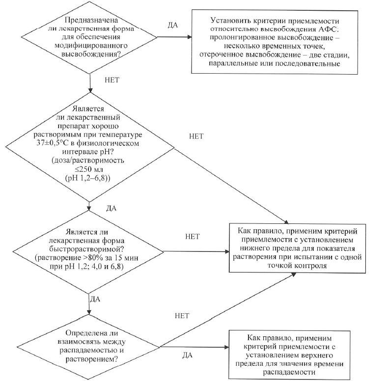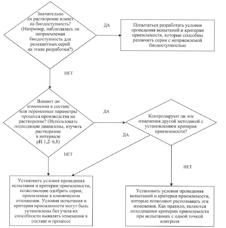 Если растворение существенно влияет на биодоступность, то необходимо установить критерии приемлемости для испытания на растворение, позволяющие отбраковать серии с неприемлемой биодоступностью. В иных случаях необходимо выбрать такие условия испытания и критерии приемлемости, которые позволят выбрать серии лекарственного препарата, пригодные для применения лекарственного препарата в медицинских целях (схема решений N 7 (2)).