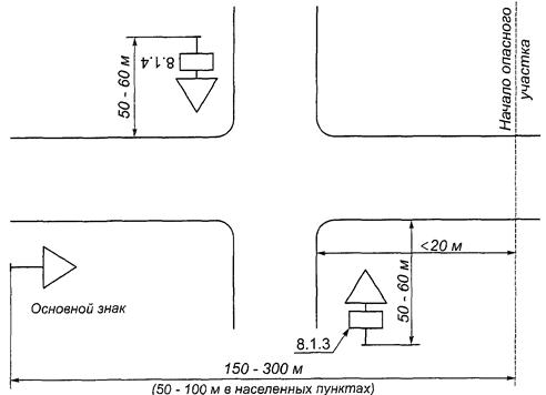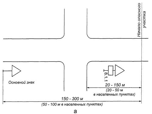 5.1.9. Знаки устанавливают непосредственно перед перекрестком, местом разворота, объектом сервиса и т.д., а при необходимости - на расстоянии не более 25 м в населенных пунктах и 50 м - вне населенных пунктов перед ними, кроме случаев, оговоренных настоящим стандартом.