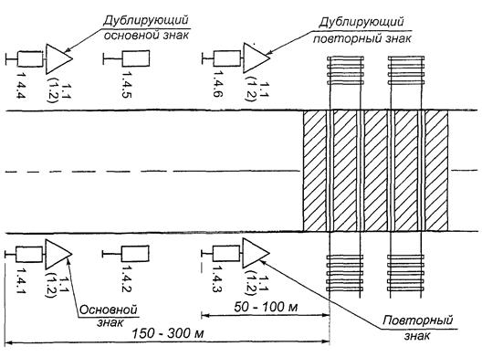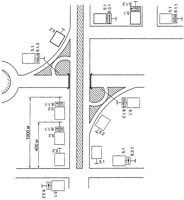 5.1.14. В одном поперечном сечении дороги устанавливают не более трех знаков без учета знаков 5.15.2, дублирующих знаков, знаков дополнительной информации, а также знаков 1.34.1 - 1.34.3 в местах производства дорожных работ.