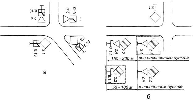 Знаки, кроме установленных на перекрестках, остановочных пунктах маршрутных транспортных средств, в местах устройства искусственных неровностей и производства дорожных работ, располагают вне населенных пунктов на расстоянии не менее 50 м, в населенных пунктах - не менее 25 м друг от друга. (в ред. Изменения N 3, утв. Приказом Росстандарта от 09.12.2013 N 2221-ст)