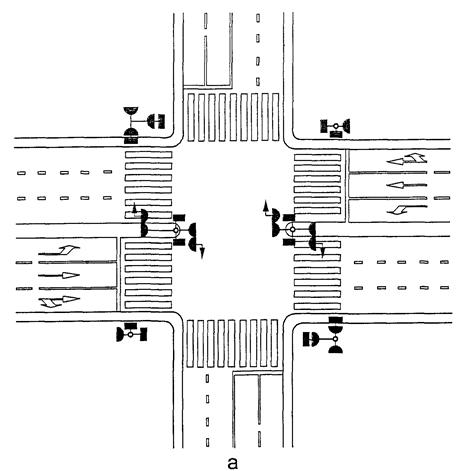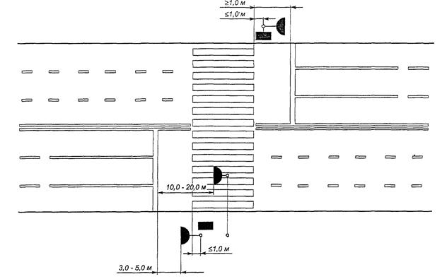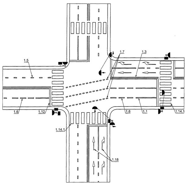 Рисунок В.18. Пример размещения светофоров и нанесения разметки на регулируемом пешеходном переходе