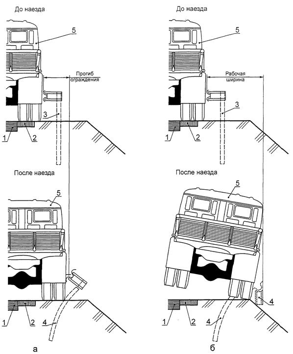 3 - изгиб балки ограждения; 4 - стойка ограждения;