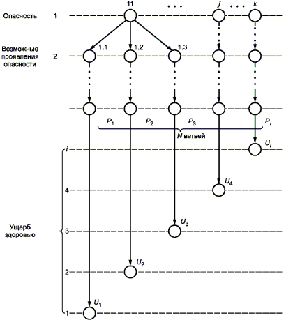Каждая i-тая ветвь дерева из общего их числа N представляет собой определенный i-тый сценарий наступления последствий проявления опасности. Вероятность реализации i-того сценария - условная вероятность конечного в ветви события. Наступление последствий по i-тому сценарию приводит к возникновению того или иного ущерба