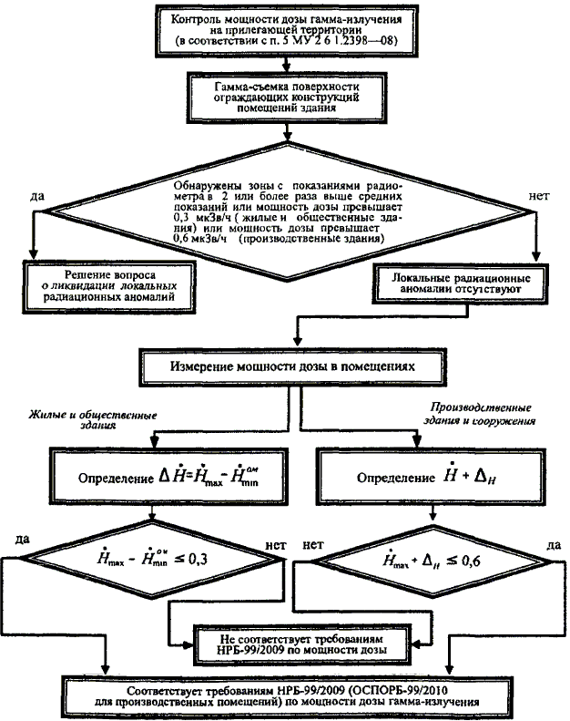 Радиационный контроль зданий начинается с оценки мощности дозы гамма-излучения. При выявлении локальных радиационных аномалий в ограждающих конструкциях здания измерения ЭРОА радона в помещениях не проводятся до установления причин возникновения аномалий и при необходимости их полной ликвидации.