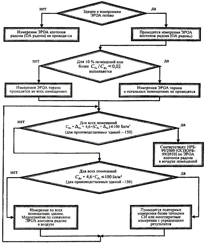 Если в результате повторных измерений установлено, что в этих помещениях условие (13) выполняется, то здание считается соответствующим требованиям НРБ-99/2009 по среднегодовой ЭРОА изотопов радона в воздухе помещений. Если по результатам квазиинтегральных измерений установлено, что в отдельных помещениях условие (13) не выполняется, то в них проводят повторные измерения ОА радона с использованием интегральных средств измерений с экспозицией не менее 15 суток.