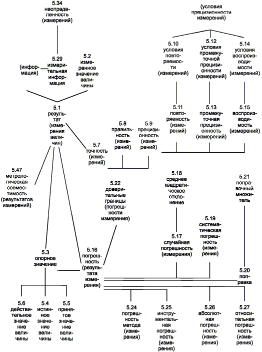 5.1. Результат (измерения величины): множество значений величины, приписываемых измеряемой величине вместе с любой другой доступной и существенной информацией. Примечания 1. Определение понятия результата измерения претерпело существенное изменение по сравнению с определением РМГ 29-99 и вобрало в себя выражение точности измерения. Информация, приводимая в результате измерения, определяется особенностями конкретного измерения и соответствует требованиям, предъявляемым к этому измерению. В большинстве случаев информация относится к точности измерения и выражается показателями точности, в обоснованных случаях содержит указание методики измерений и др. 2. Результат измерения может быть представлен измеренным значением величины с указанием соответствующего показателя точности. К показателям точности относятся, например, среднее квадратическое отклонение, доверительные границы погрешности, стандартная неопределенность измерений, суммарная стандартная и расширенная неопределенности. VIM3 [1] предусматривает также представление результата измерений плотностью распределения вероятностей на множестве возможных значений измеряемой величины. 3. Если значение показателя точности измерений можно считать пренебрежимо малым для заданной цели измерения, то результат измерения может выражаться как одно измеренное значение величины. Во многих областях это является обычным способом выражения результата измерения, с указанием класса точности применяемого средства измерений. | | measurement result, result of measurement |