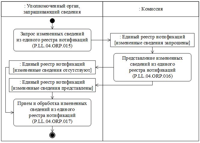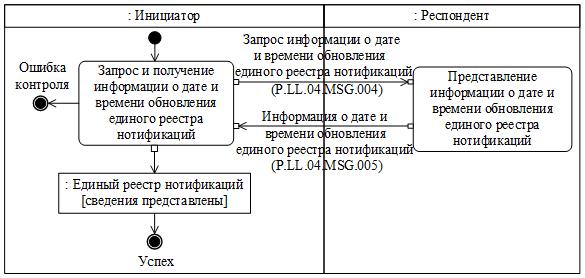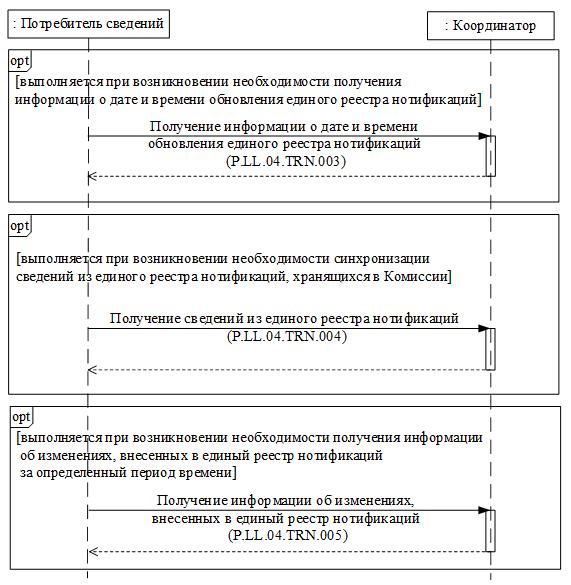 Запрос информации о дате и времени обновления единого реестра нотификаций выполняется уполномоченным органом, запрашивающим сведения, в целях оценки необходимости синхронизации хранящихся в информационной системе уполномоченного органа, запрашивающего сведения, сведений о нотификациях, включенных в единый реестр нотификаций, со сведениями, содержащимися в едином реестре нотификаций и хранящимися в Комиссии. При осуществлении запроса выполняется процедура "Получение информации о дате и времени обновления единого реестра нотификаций" (P.LL.04.PRC.003).