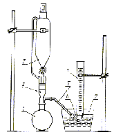 1 -колба лабораторная круглодонная, 2 -переход с одной горловиной и отводом, 3 -капельная воронка, 4 -цилиндр мерный, 5 -трубка поливинилхлоридная, 6 -трубка стеклянная изогнутая, 7 -сосуд стеклянный четырехугольный