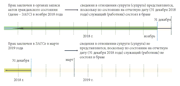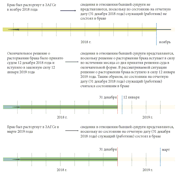 19. При представлении сведений в отношении супруги (супруга) следует учитывать положения статей 10 "Заключение брака" и 25 "Момент прекращения брака при его расторжении" Семейного кодекса Российской Федерации.