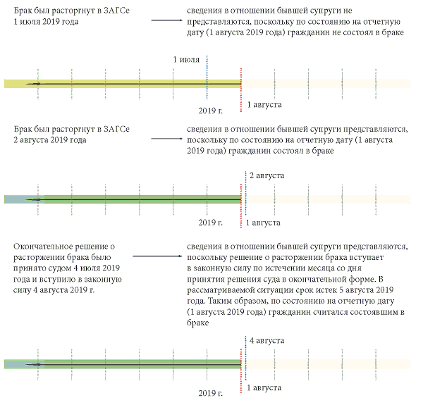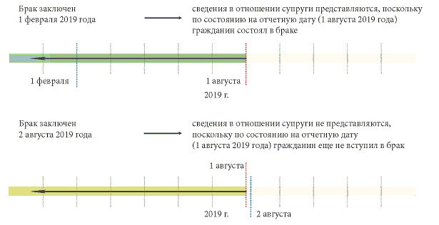 Пример 2: гражданин в сентябре 2019 года представляет сведения в связи с подачей документов для назначения на должность. Отчетной датой является 1 августа 2019 года