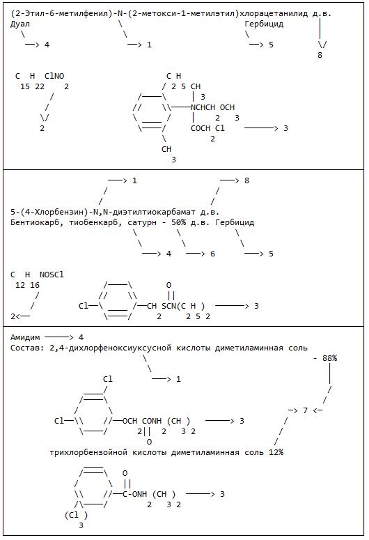В первой графе даны: химическое название вещества, его товарное название, через запятую даны названия-синонимы. Кроме того, графа содержит формулы вещества - эмпирическую и структурную или одну из них. В случае смесевых препаратов (наряду с их товарными названиями) перечислены конкретные химические компоненты смеси и их процентное содержание в рецептуре (рис. 1).