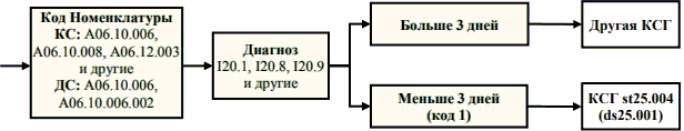 Данные КСГ предназначены для оплаты краткосрочных (не более трех дней) случаев госпитализации, целью которых является затратоемкое диагностическое обследование при болезнях системы кровообращения.