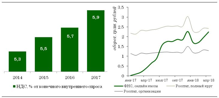 Постепенная легализация сферы потребления: 50% рост средней выручки на одну кассу, резкое ускорение роста поступлений НДС по сектору розничной торговли (+38% в 2017 году), увеличение регистрируемой выручки до оценочного уровня розничной торговли, включающего досчеты на не наблюдаемой прямыми статистическими методами объемы.