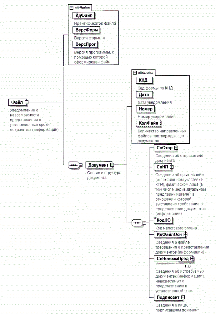 | Сведения об истребуемых документах (информации), невозможных к представлению в установленный срок | СвНевозмПред | С | | ОМ | Состав элемента представлен в таблице 4.6 |