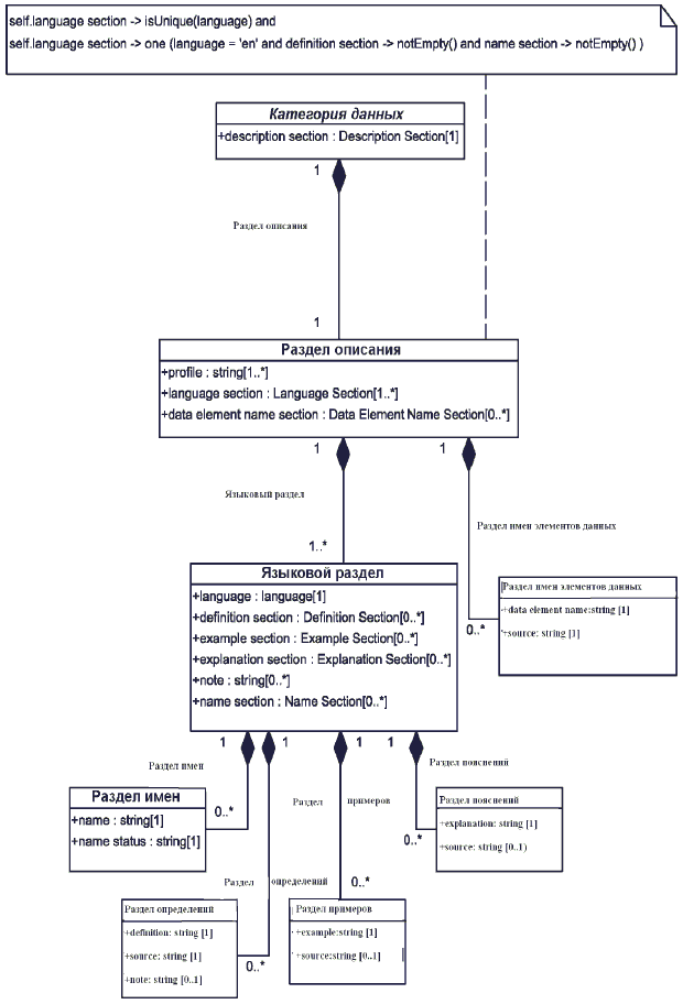 3.3.10 языковой раздел (language section): Класс в спецификации категории данных, предоставляющий эквиваленты на рабочем языке для имен категорий данных и других описаний, включенных в спецификацию категории данных.