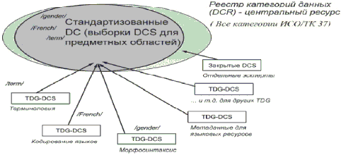 3.2.1 реестр категорий данных (Data Category Registry; DCR): Совокупность категорий данных, используемая в области языковых ресурсов в качестве базы определений лингвистических схем аннотации или любых других форматов.
