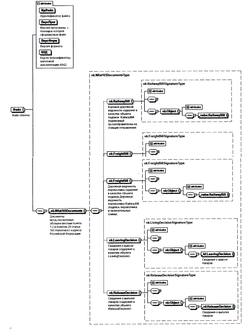 Обязательным приложением к XML схеме файла обмена является XML схема документа-контейнера (NKst165.xsd), в котором находятся сведения документов и сведений (сообщений), являющихся аналогами отметок, проставляемых таможенными органами на транспортных, перевозочных документах (железнодорожной накладной), в случае их истребования в соответствии с абзацем шестым пункта 1.2 и пунктом 20 статьи 165 Налогового кодекса Российской Федерации, в электронной форме.
