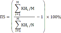 5. Показатель П5 должен рассчитываться по платежной системе в целом и для каждого оператора УПИ в отдельности как темп прироста среднедневного количества инцидентов за оцениваемый календарный месяц по отношению к среднедневному количеству инцидентов за предыдущие 12 календарных месяцев, включая оцениваемый календарный месяц, рассчитываемый по следующей формуле: