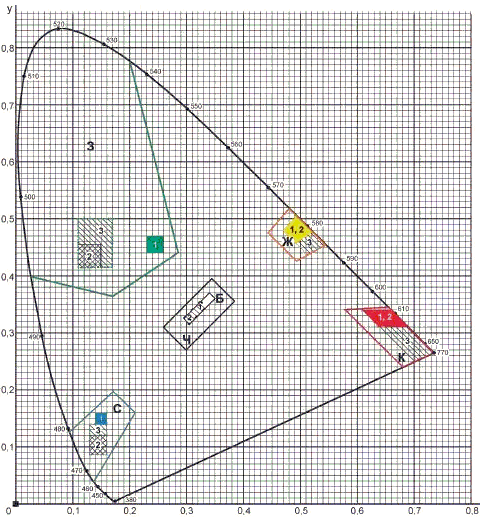 - на цвета, применяемые для световой сигнализации всех видов транспорта, транспортных средств и дорожного движения;