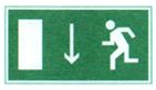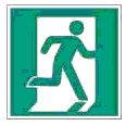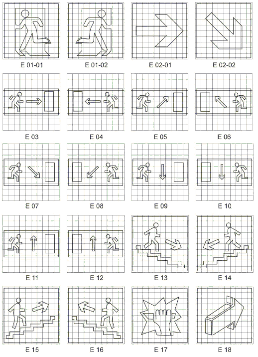 | E22 | Указатель выхода | Над дверями эвакуационного выхода или в составе комбинированных знаков безопасности для указания направления движения к эвакуационному выходу | |