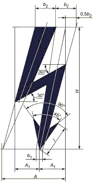 <**> Ширина b может быть увеличена на 2/7 H' для диакритических букв во избежание соприкосновения их друг с другом.