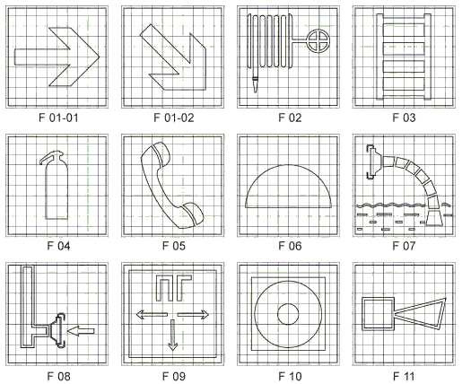 - обозначения пожарной техники, средств противопожарной защиты, их элементов;