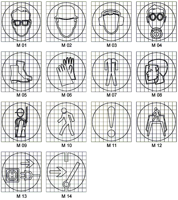 | M11 | Общий предписывающий знак (прочие предписания) | Для предписаний, не обозначенных настоящим стандартом. Знак необходимо применять вместе с поясняющей надписью на дополнительном знаке безопасности | |