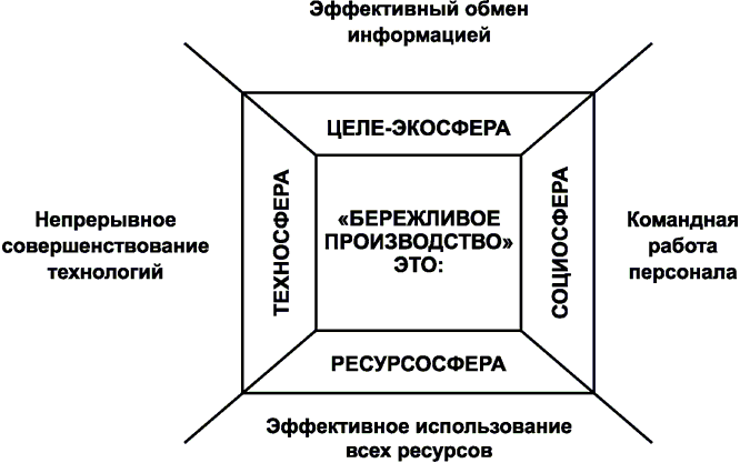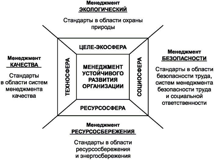 Кажущиеся разнородными стратегии развития международной и межгосударственной стандартизации (в областях производственного менеджмента качества, экологического менеджмента, обеспечения безопасности и ресурсосбережения, в т.ч. "бережливого производства") образуют четыре стратегических блока, четко ориентированных по сторонам квадрата и только совместно (в общесистемном единстве) определяющих устойчивое развитие организаций, реализуемое в любом пространственно-временном континууме. Это положение становится понятным и наглядным при рассмотрении рисунка А.2.