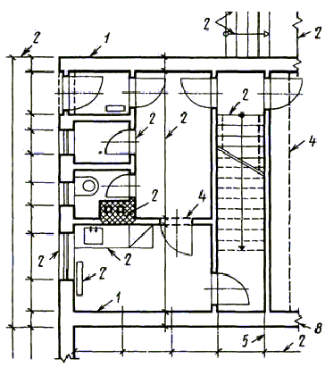 4. В строительных чертежах в разрезах видимые линии контуров, не попадающие в плоскость сечения, допускается выполнять сплошной тонкой линией (черт. 9).