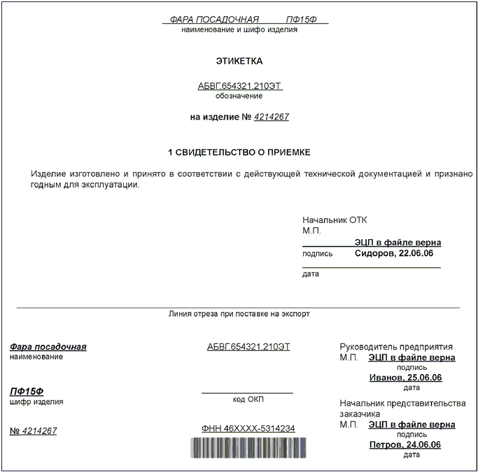 4.4 Этикетка изделия АТ - удостоверяющий документ, оформляемый для неремонтируемых изделий, подтверждающий соответствие экземпляра изделия утвержденной конструкторской документации и возможность его установки на основное изделие определенной типовой конструкции, а также содержащий значения основных параметров и характеристик изделия, эксплуатационные ограничения, сведения о его техническом состоянии, движении в эксплуатации и гарантии изготовителя (при необходимости).