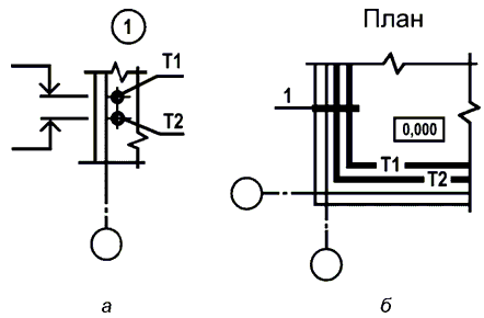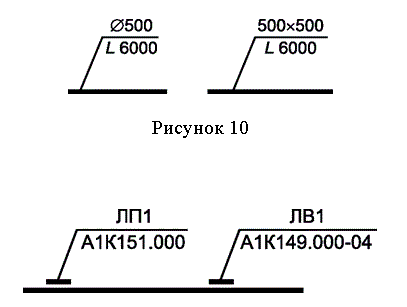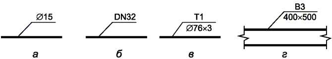 В случае, когда буквенно-цифровое обозначение трубопровода или системы наносят на полке линии-выноски, допускается указывать под полкой линии-выноски диаметр трубопровода или диаметр (размеры сечения) воздуховода (см. рисунки 2 в, 2 г).