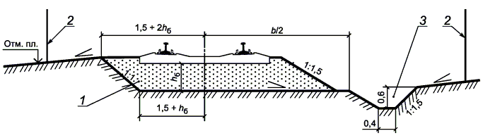 1 - балластная призма; 2 - граница отвода земель; 3 - кювет; - толщина балластного слоя