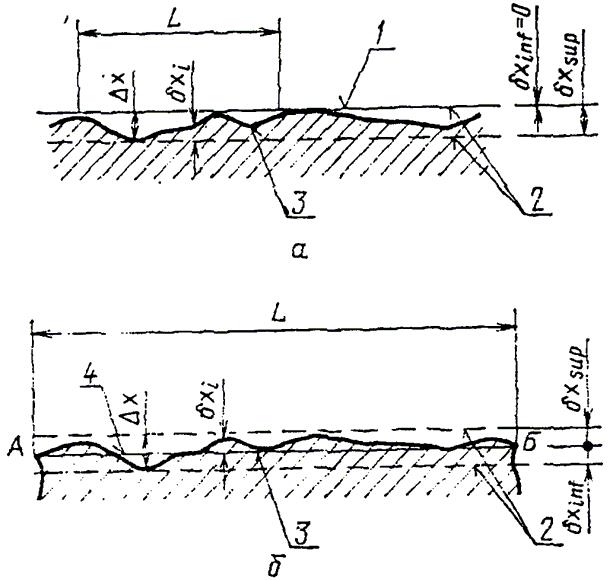 а - допуск и отклонение от прямолинейности при измерениях на заданной длине; б - то же, при измерениях на всей длине; 1 - условная (прилегающая) прямая; 2 - прямые, ограничивающие поле допуска; 3 - реальный профиль; 4 - условная (проходящая через крайние точки) прямая