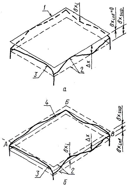 а - допуск плоскостности и отклонение от плоскостности при измерениях от прилегающей плоскости; б - то же, при измерениях от условной плоскости, проходящей через три крайние точки реальной поверхности; 1 - условная (прилегающая) плоскость; 2 - плоскости, ограничивающие поле допуска; 3 - реальная поверхность; 4 - условная (проходящая через три крайние точки) плоскость