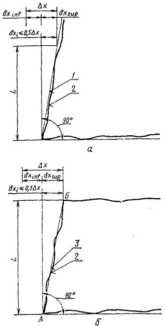 а - допуск и отклонения при измерениях на заданной длине; б - то же, при измерениях на всей длине; 1 - условная (прилегающая) плоскость; 2 - реальная поверхность; 3 - условная (проходящая через крайние точки) плоскость