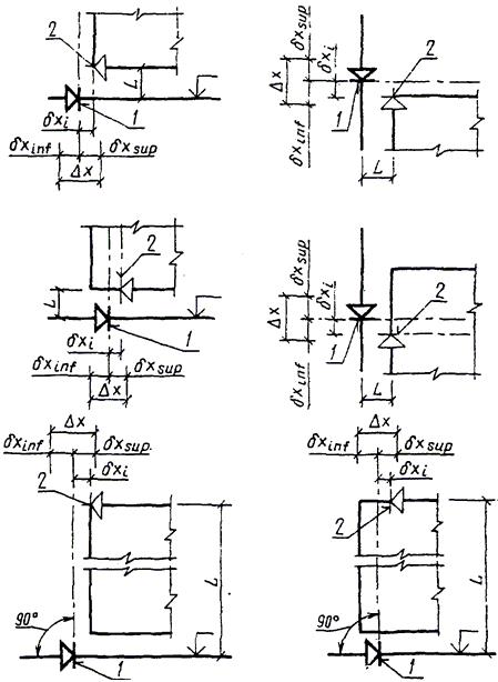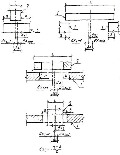 4.2. Точность установки элементов сборных зданий и сооружений характеризуют допусками совмещения и отклонениями от совмещения ориентиров (точек, линий, поверхностей) (черт. 11) и допусками симметричности и отклонениями от симметричности установки элементов (черт. 12).