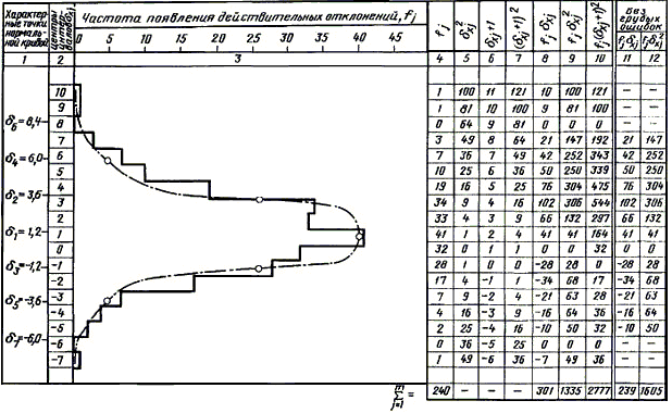4. Для построения на чертеже гистограммы кривой нормального распределения в соответствии с п. 4 Приложения 1 были вычислены координаты точек кривой - отклонения и соответствующие им частоты f.