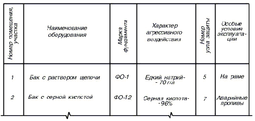 На листе, где помещен план, в таблице по форме 4 приводят данные об агрессивных воздействиях на фундаменты под оборудование.