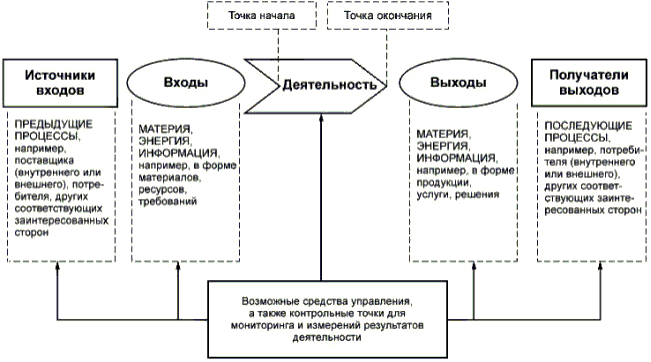 Рисунок 1 дает схематичное изображение любого процесса и иллюстрирует взаимосвязь элементов процесса. Контрольные точки мониторинга и измерения, необходимые для управления, являются специфическими для каждого процесса и будут варьироваться в зависимости от соответствующих рисков.