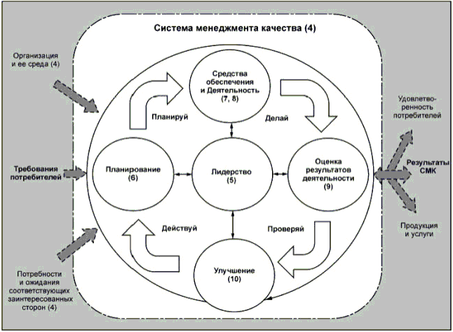 Цикл PDCA может быть применен ко всем процессам и к системе менеджмента качества в целом. Рисунок 2 иллюстрирует, как разделы 4 - 10 могут быть сгруппированы в соответствии с циклом PDCA.